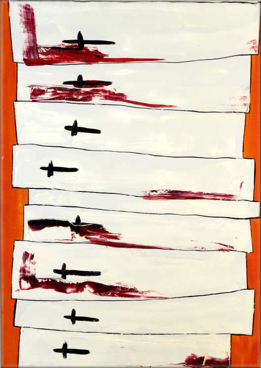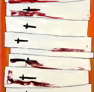 This three-part work employs abstract forms to deliver a direct political statement. The vertical fields in the first panel represent parties and power blocs. The second panel shows stacked, anonymized coffins—white, heavy, marked only by traces of individuality. The third panel opens into a black void, symbolizing the societal collapse that follows when lives become variables in a political equation.