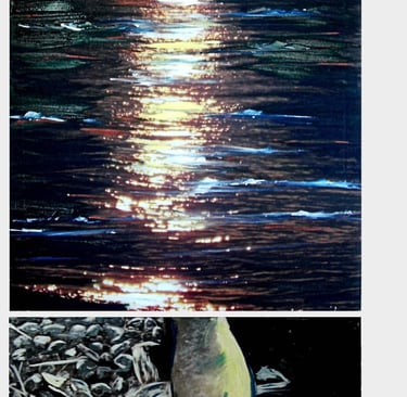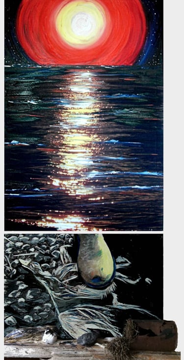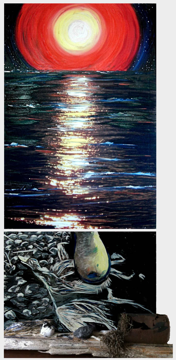 The piece merges a painted-over photograph with objects collected from the shore. Oil paint interacts with wood fragments and washed-up debris, forming a charged collage between aesthetic surface and ecological truth. The idealized image confronts the raw materials that speak of damage, pollution, and the human footprint.
