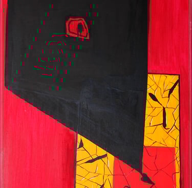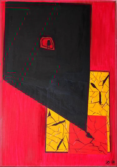 The painting addresses the unseen, often silenced impact of violence against children within society. The black form cuts into a fragile center, symbolizing the cold force of power, harm, and the rupture of inner worlds. The contrasting colors reflect the tension between external severity and inner vulnerability.