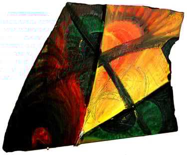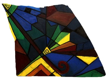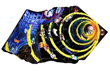 The second study continues the process of unveiling. The previously concealed core unfolds into a dynamic chromatic field suggesting expansion, transformation, and emergence. The radial gradients function as energetic vectors, while the embedded fragments reference transitions between states, time, and material. The work explores the phenomenon of reappearance—the return of energy, the formation of new structures, and the shift from latent to active presence