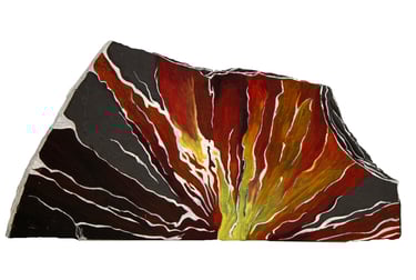 This work explores the moment when energy becomes visible within matter. Radiant reds and yellows unfold like eruptive forces emerging from the dark slate, while fine, luminous lines trace the stone’s internal tension. Color and material coexist in a field of pressure between eruption and structure – an image of what breaks open from within.