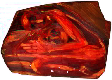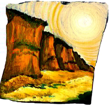 This work reimagines the cliffs of Nienhagen as a dialogue between mass and light. Warm earth tones meet a radiating, spiraling sun, while the brushstrokes follow the natural structure of the slate. The result is a landscape charged with heat, movement, and quiet geological tension.