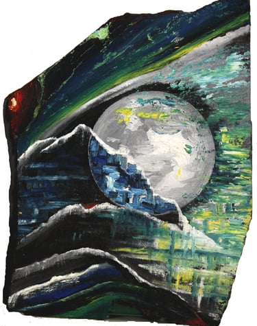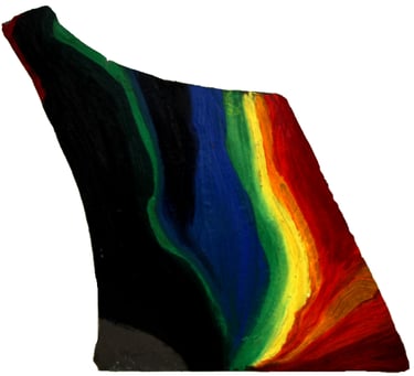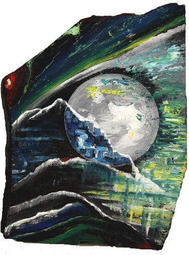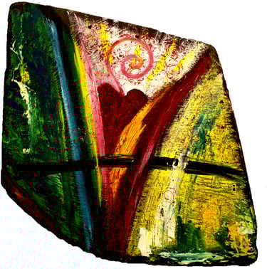 A work about the encounter of two forces: the weight of stone and the radiance of color. The flowing bands follow the natural shape of the slate while revealing its inner rhythm. A dialogue between material and gesture – between stillness and motion.