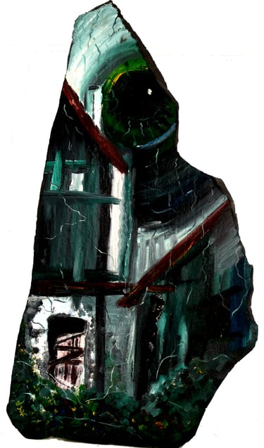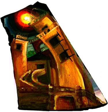 The glowing sky and the spiral above the roof echo an inner shift — a time of honesty, exposure, and quiet transformation.