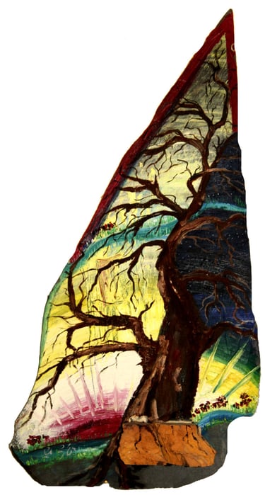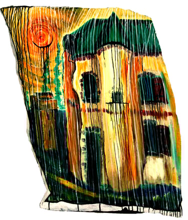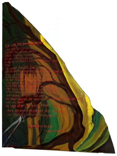 A fragment of the destroyed house and the surviving tree merge into a study of origin, loss, and return. The material carries what once was, while the colors and lines articulate a new kind of arrival: suspended between destruction and continuity, between what ended and what endures.